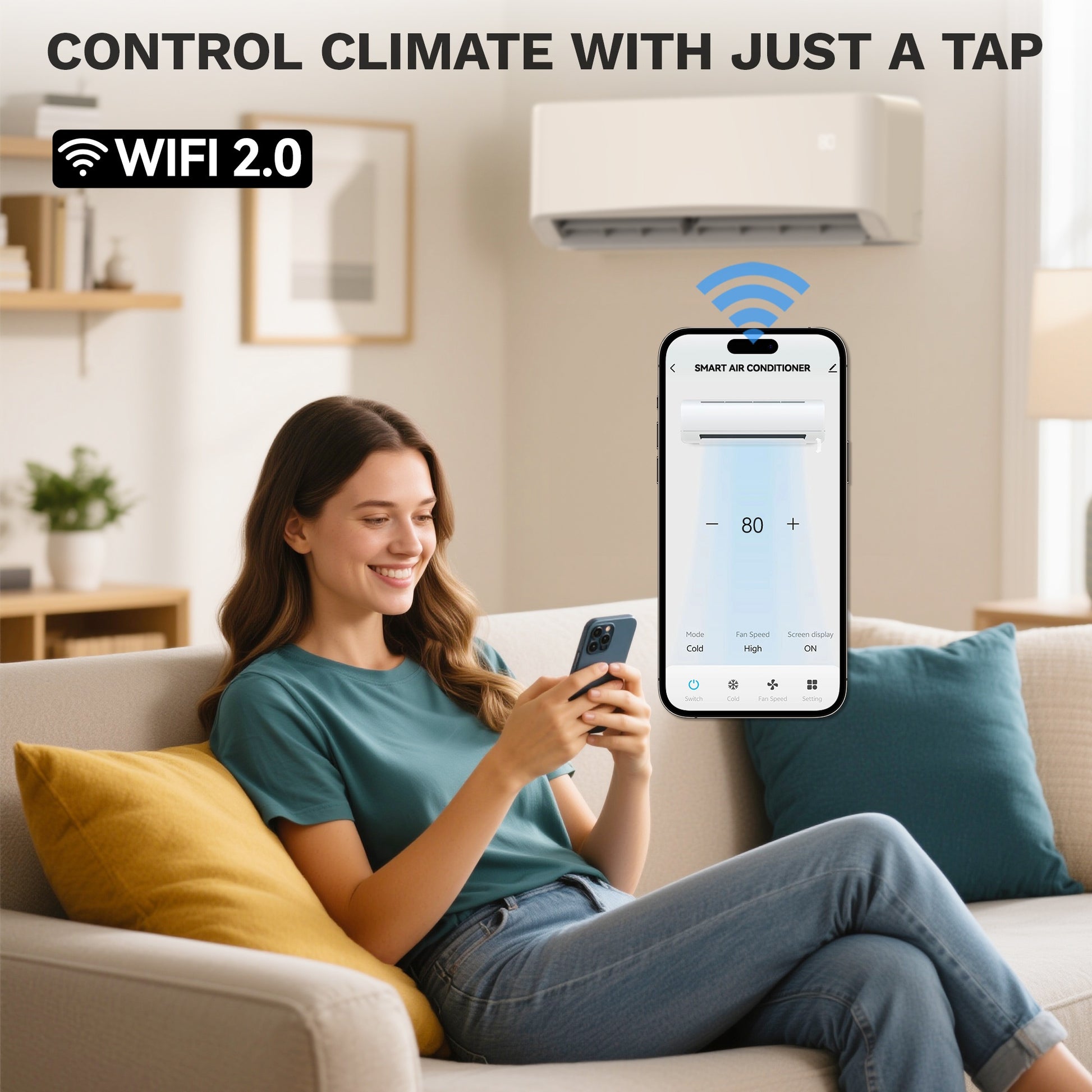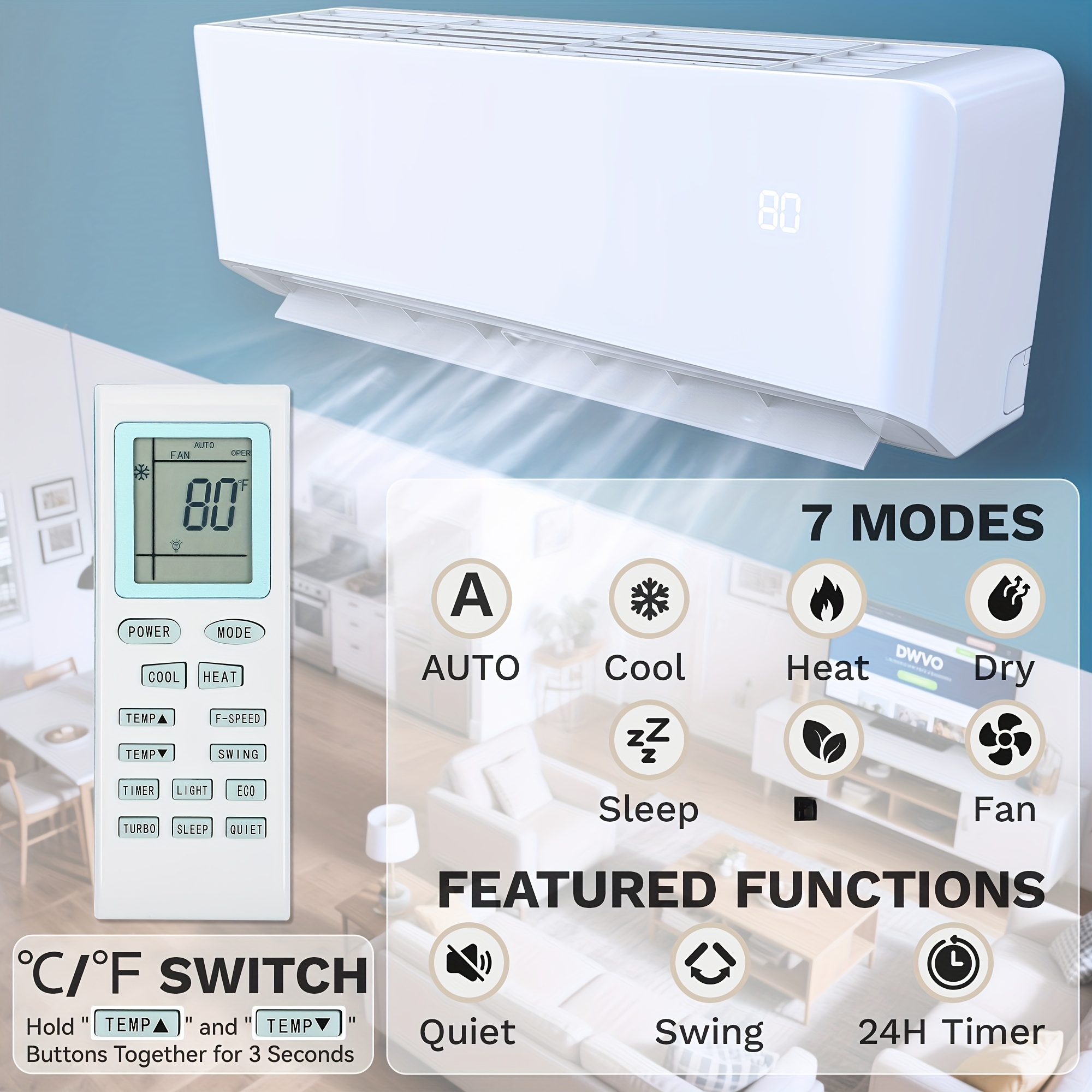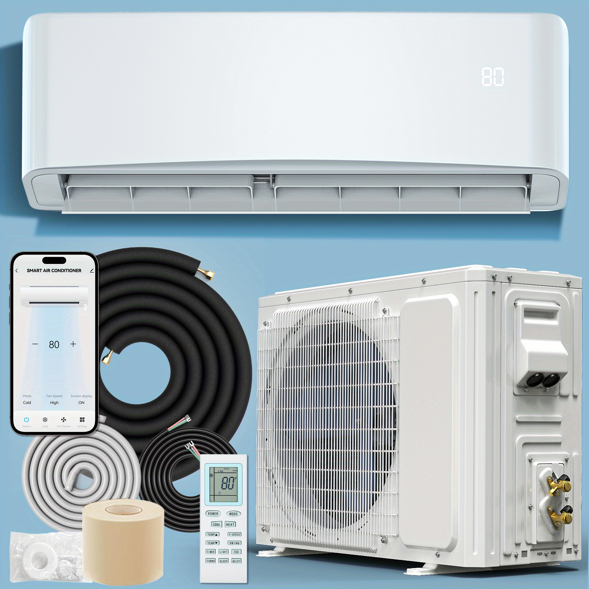 This mini split AC unit offers five functions in one: you can effortlessly toggle between automatic, cooling, dehumidifying, heating, and fan settings. It features WiFi connectivity for app control, a 24-hour timer, sleep mode, ECO settings, turbo mode, and memory for swing and louver positions, ensuring total comfort personalization. Additionally, it includes anti-cold air technology, temperature adjustment features, and a switch for Celsius or Fahrenheit for user-friendly daily operation.