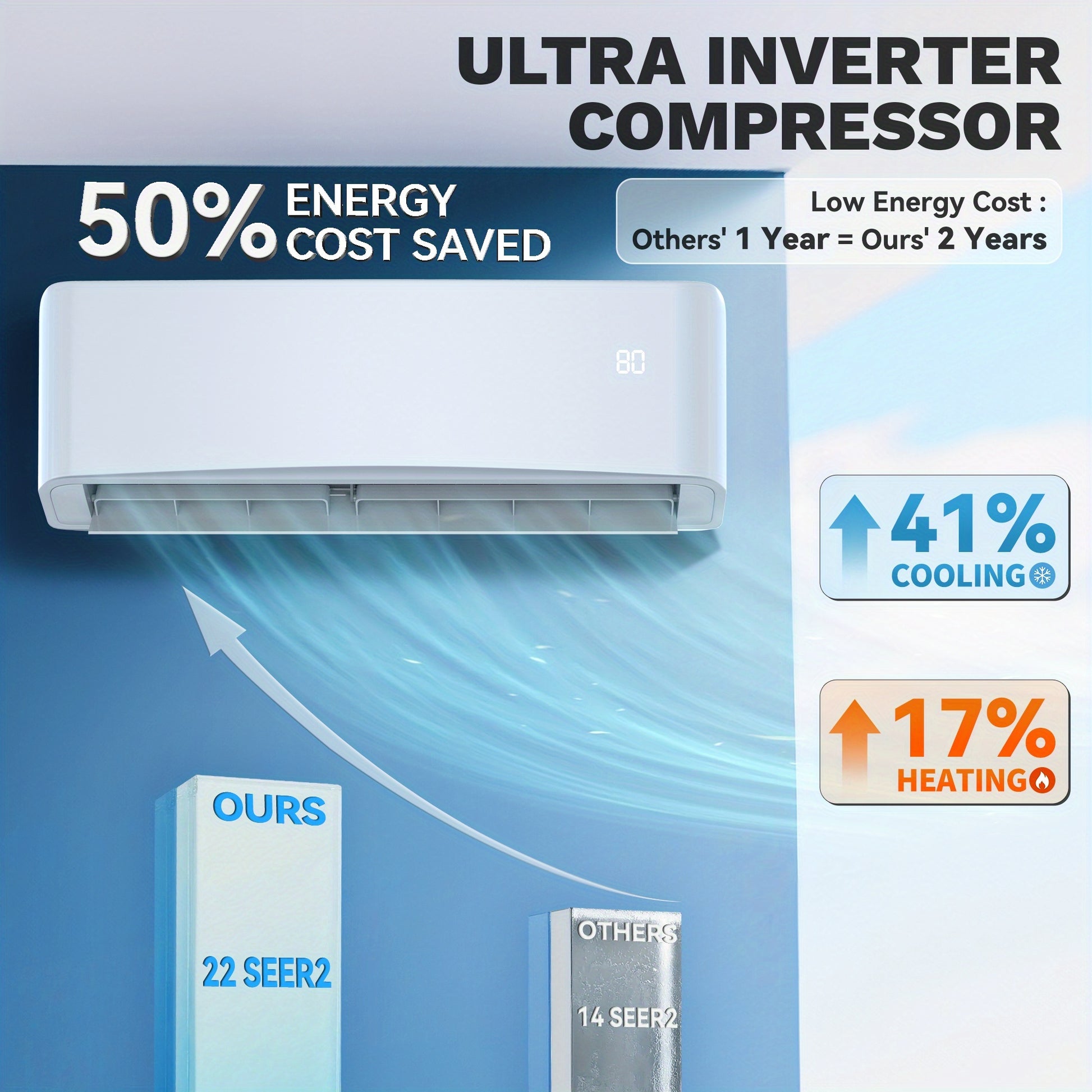Stay comfortable throughout the year: Combat the summer warmth or winter cold with this 9000/12000 BTU mini split air conditioning and heating system; reliable operation; Utilizing cutting-edge inverter technology, it reduces energy consumption by 50% and can service areas ranging from 450 to 750 square feet; Ideal for bedrooms, living areas, basements, garages, RVs, or business environments.