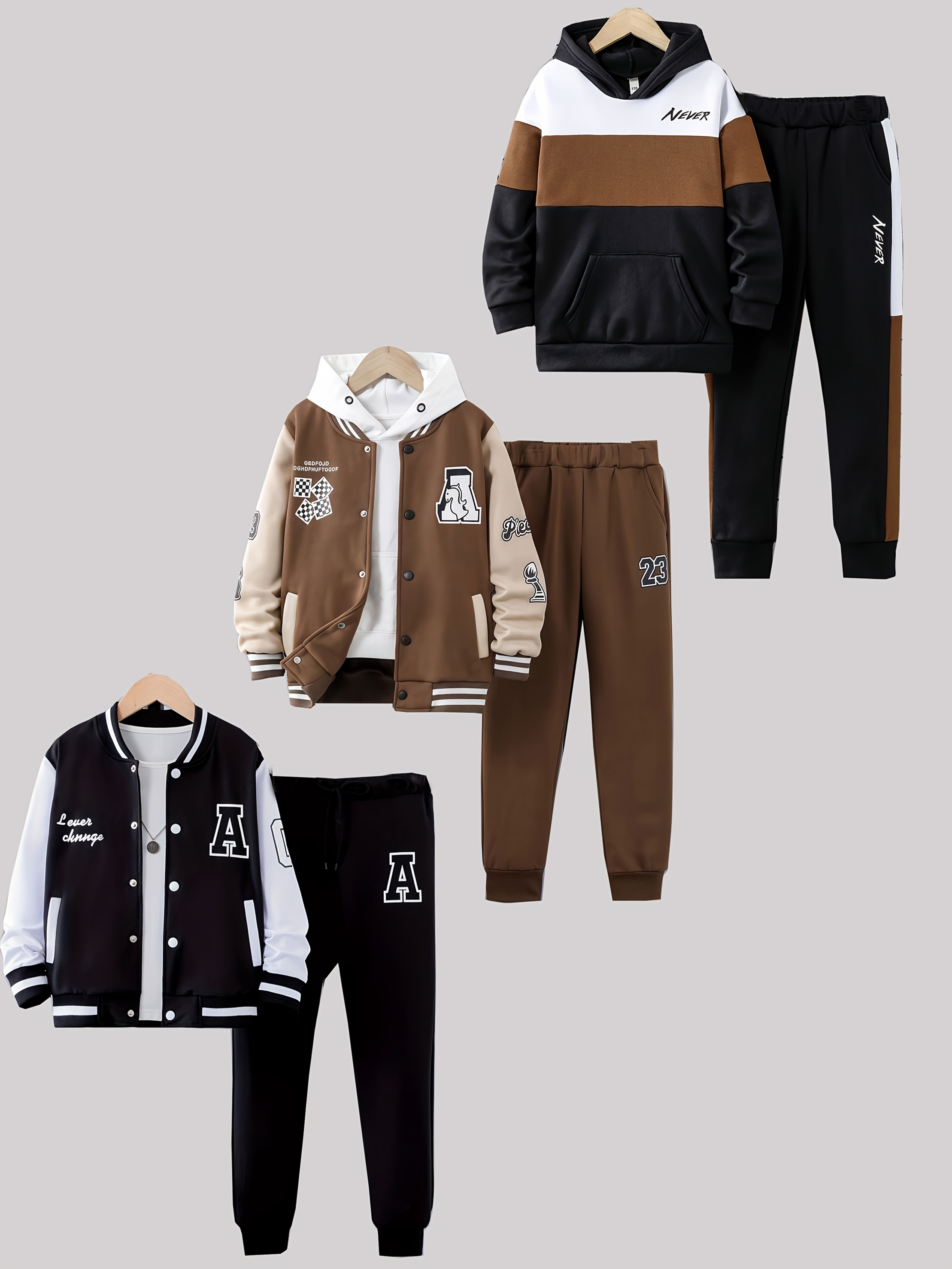 6pcs - Autumn and Winter New Boys' Fashion Long Pants Set with Printed Sports Casual Outdoor Outfit 3pcs of Tops and 3pcs of Pants, Perfect for Outdoor