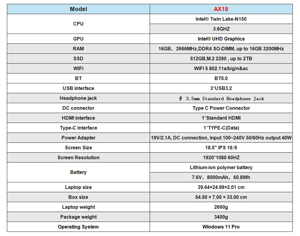 ACEMAGIC 18.5"Laptop Computer Windows 11 PRO 8000 mAh Battery Intel N150 Quad-Core Processor 16GB DDR4 RAM 512GB SSD Wifi5