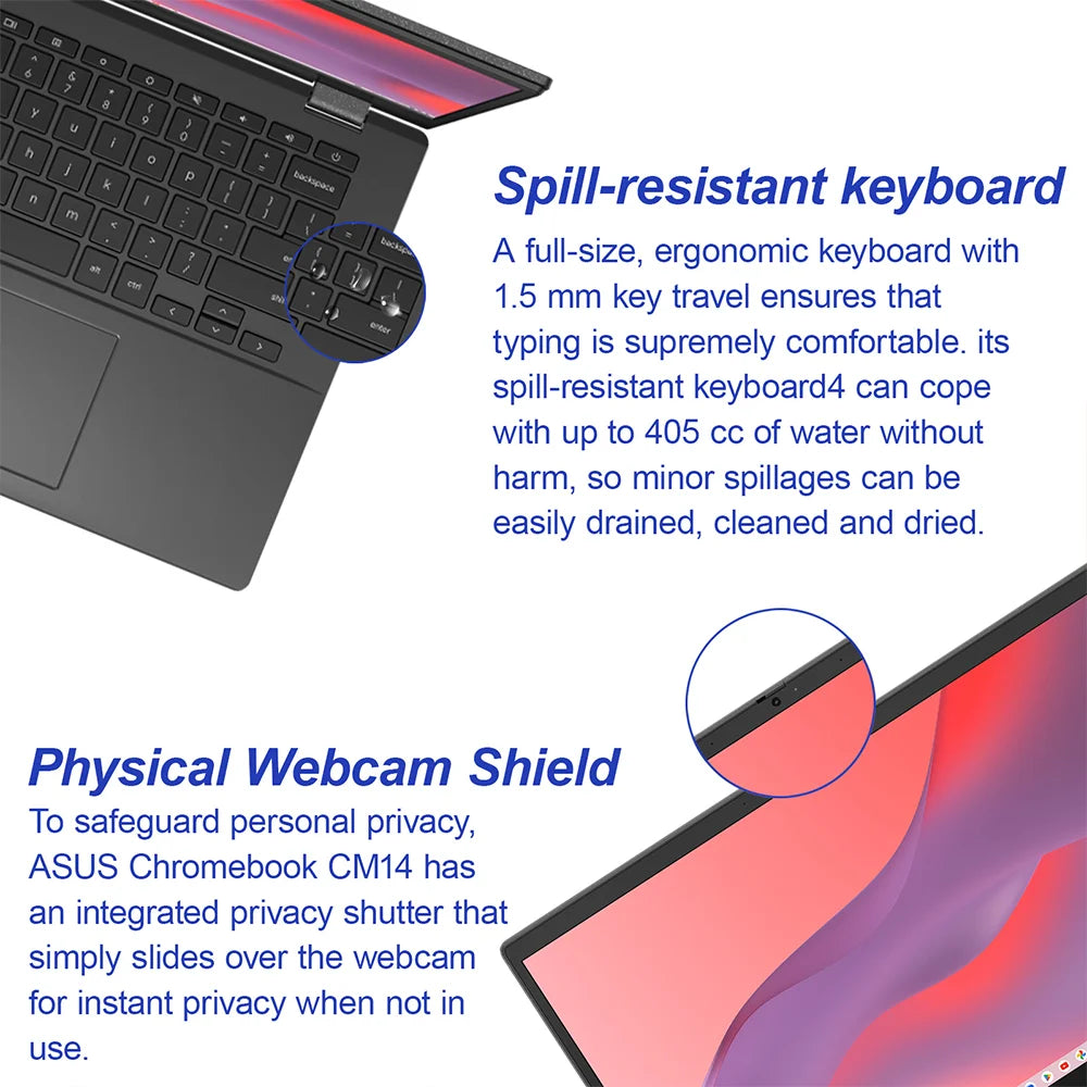 ASUS Chromebook CM14 is made for boosting productivity and having more fun — all day, every day. An efficient MediaTek Kompanio 520 processor and up to 15-hour battery life* gives you the freedom to stay productive throughout the day.
