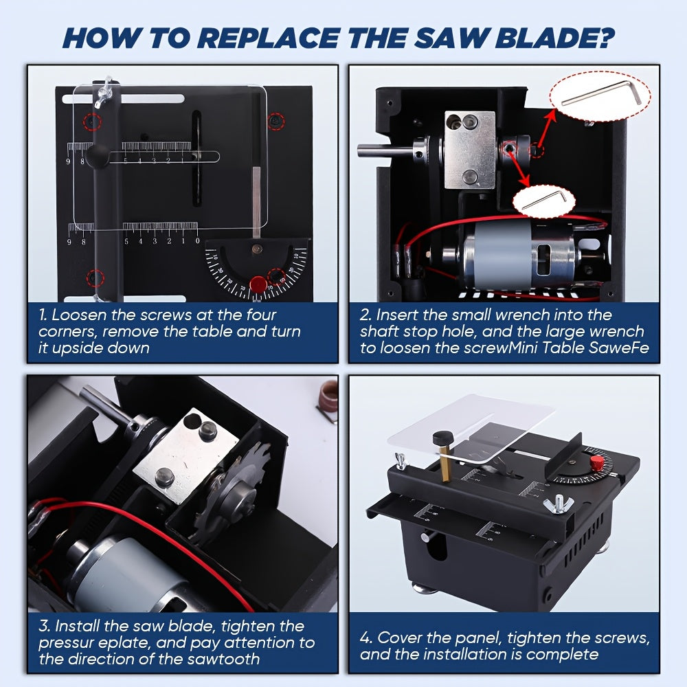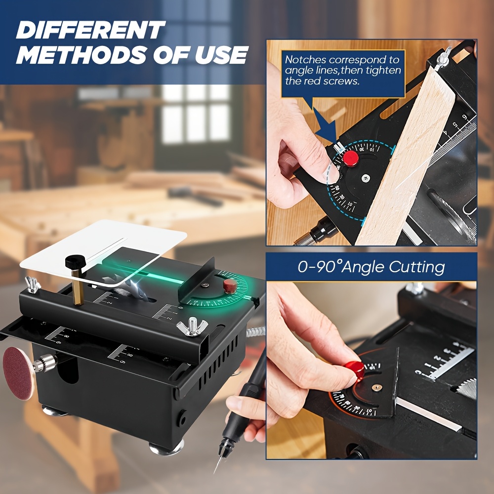 【 Powerful motor and adjustable speed 】This electric desktop saw is driven by an upgraded 100W strong pure copper motor, with a speed of up to 6000rpm/min. Adjustable with 7 speeds, precise, efficient, fast, and easy to achieve cutting operations. 【Accurate cutting】The desktop saw panel has clear markings for stable, accurate, and straight cutting. Integrated cast iron body, sturdy and durable, suitable for long-term use. Transparent baffles prevent the splashing of debris. The bottom four corne