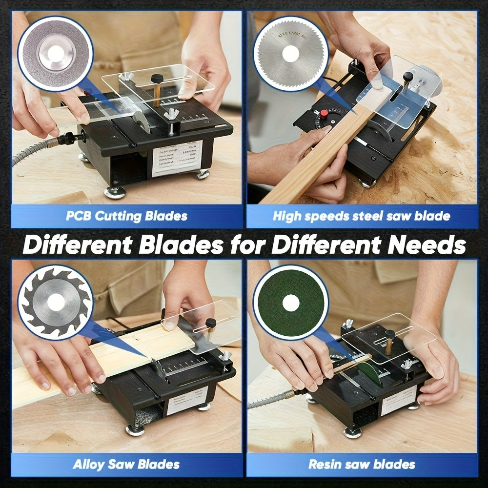 【 Multi functional Mini Table Saw 】Specially designed for small items, suitable for materials such as PCB boards, wooden sticks, plastic sheets, thin wooden boards, cans, copper-clad panels, aluminum tubes, copper tubes, etc. Provide four different materials of circular saw blades for different cutting needs: PCB cutting blades, high-speed steel saw blades, alloy saw blades, and resin saw blades. Saw blade size: diameter 63 millimeters, inner hole 16 millimeters.