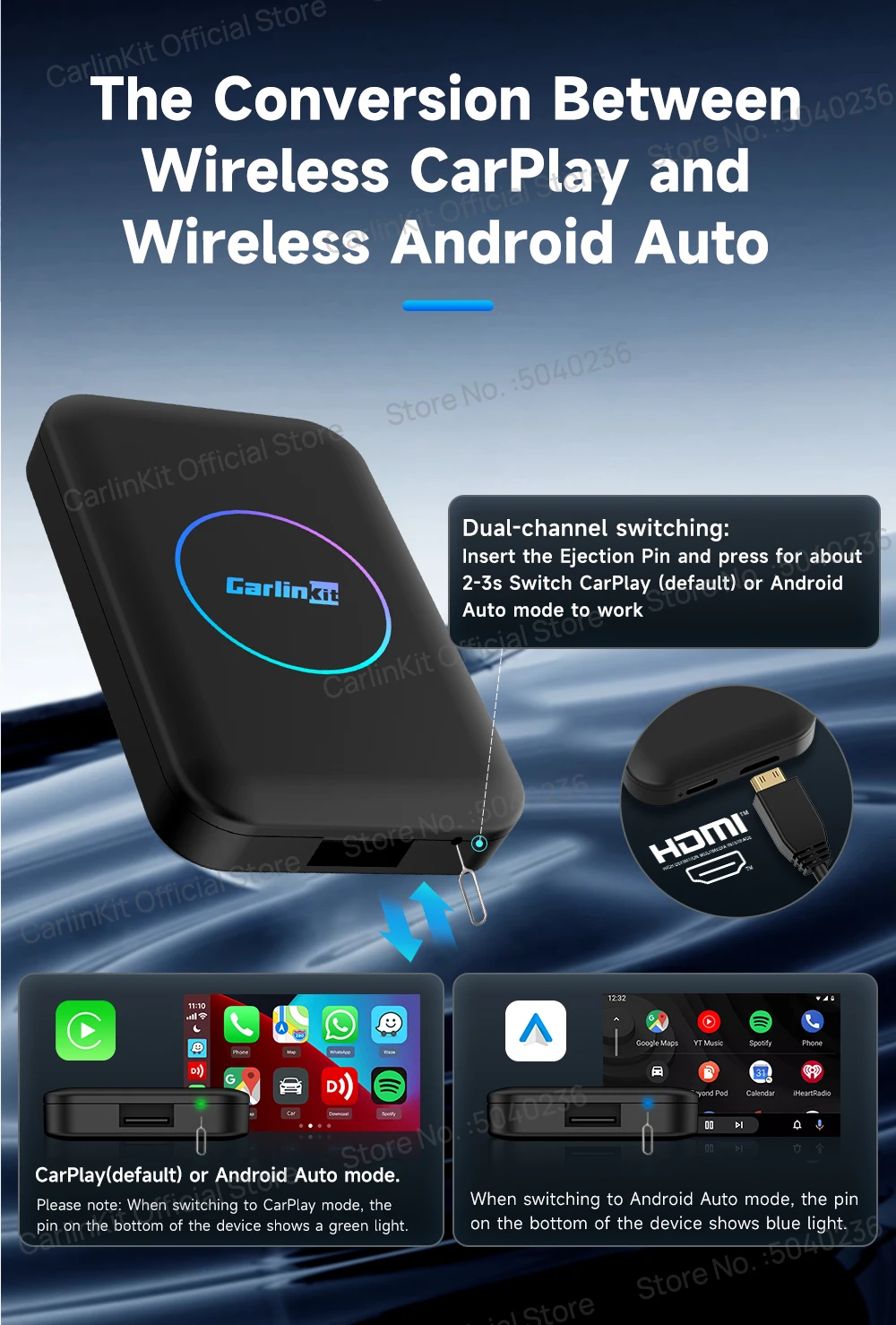 This CarPlay wireless adapter with full Android system supports wireless carplay for iPhone(IOS10+) and wireless android auto for Android phones(android11+) . It supports all control modes of the original vehicle, such as voice control, knob control, steering wheel control, touch screen control.Easily display your favorite apps on your car display.