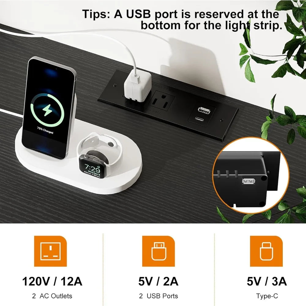 - 55” Dresser TV Stand with Charging Station: The charging station is equipped with 2 standard plug sockets, 2 USB ports, 1 Type-C and a 4.9-foot power cord. Multiple devices such as mobile phones, headphones, watches, computers, etc. can be charged at the same time