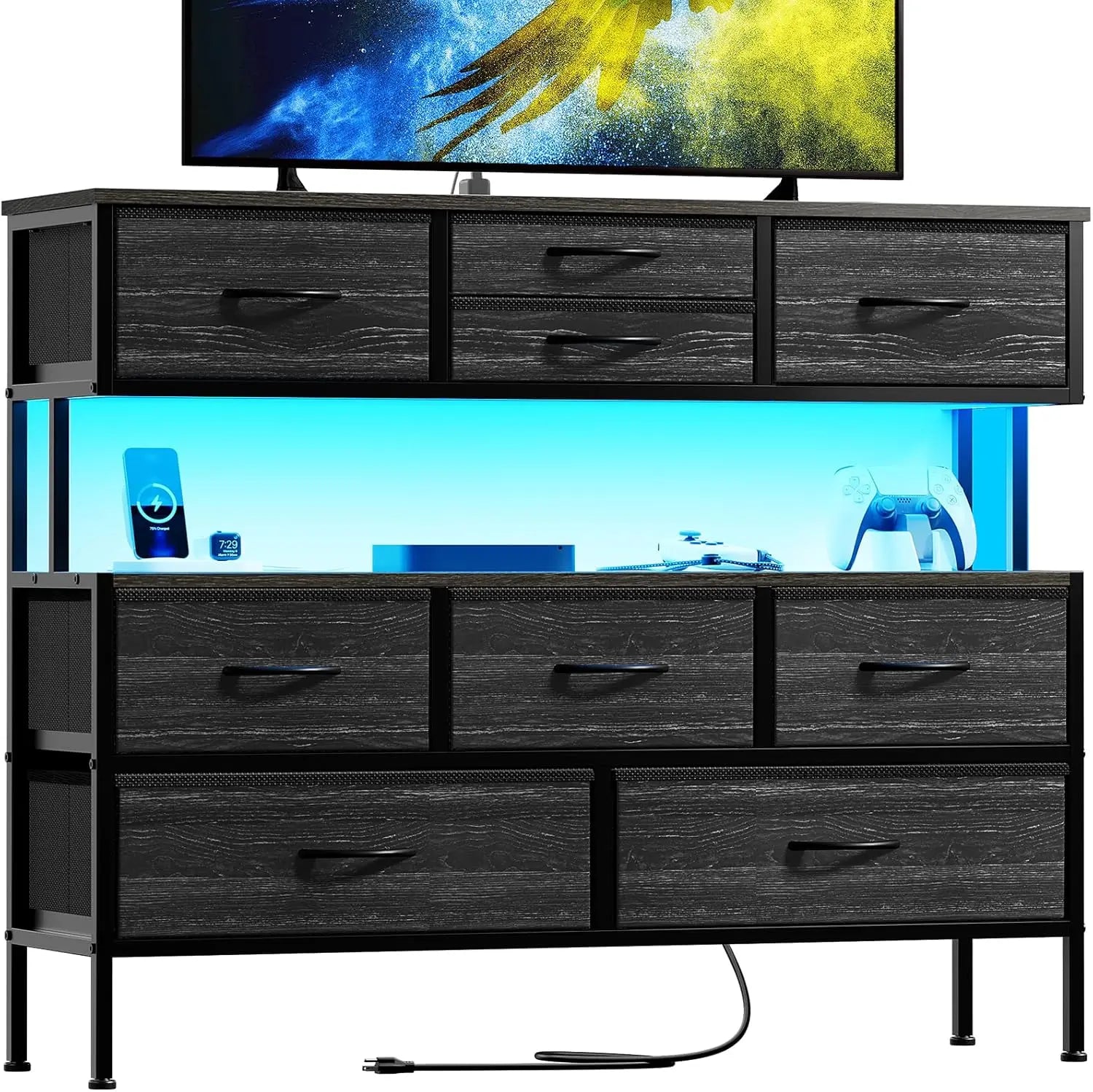 Dresser TV Stand with Charging Station and LED Lights, 55” TV Stand with 9 Drawers, Fabric Dresser for Bedroom, Steel Frame