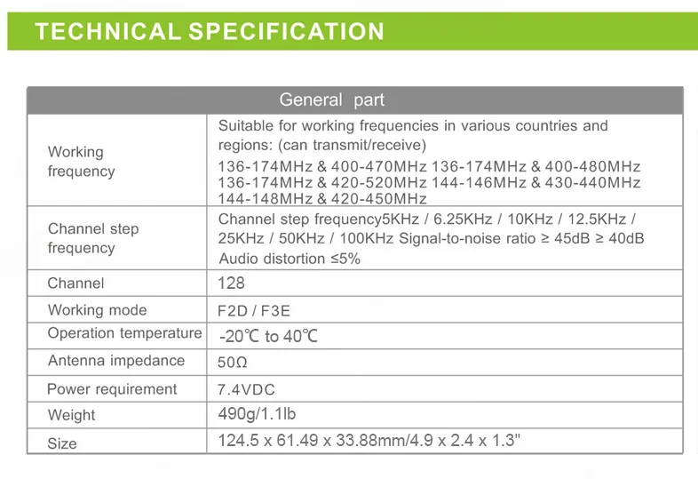 - Strong and stable output power (VHF: 12W/UHF: 12W)