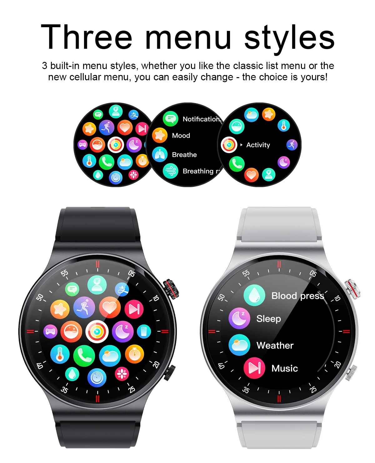 Bluetooth calling, heart rate/blood pressure/blood oxygen/pressure/sleep monitoring,Date/week display, weather push, menstrual cycle (app-gender is set to female only), countdown, card management, remote photography, sedentary reminder, step counting, distance, calories, Bluetooth music control, call reminder, SMS reminder, social APP message reminder, alarm clock reminder, exercise mode, raise your hand to brighten the screen, find mobile phone, stopwatch, reject calls, do not disturb mode, multi-dial Switching, brightness adjustment, firmware upgrade, etc.