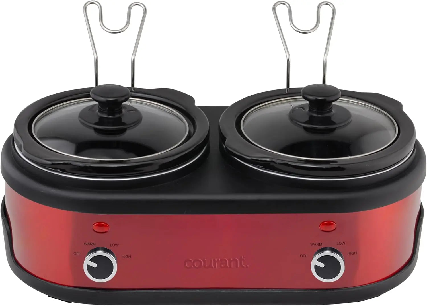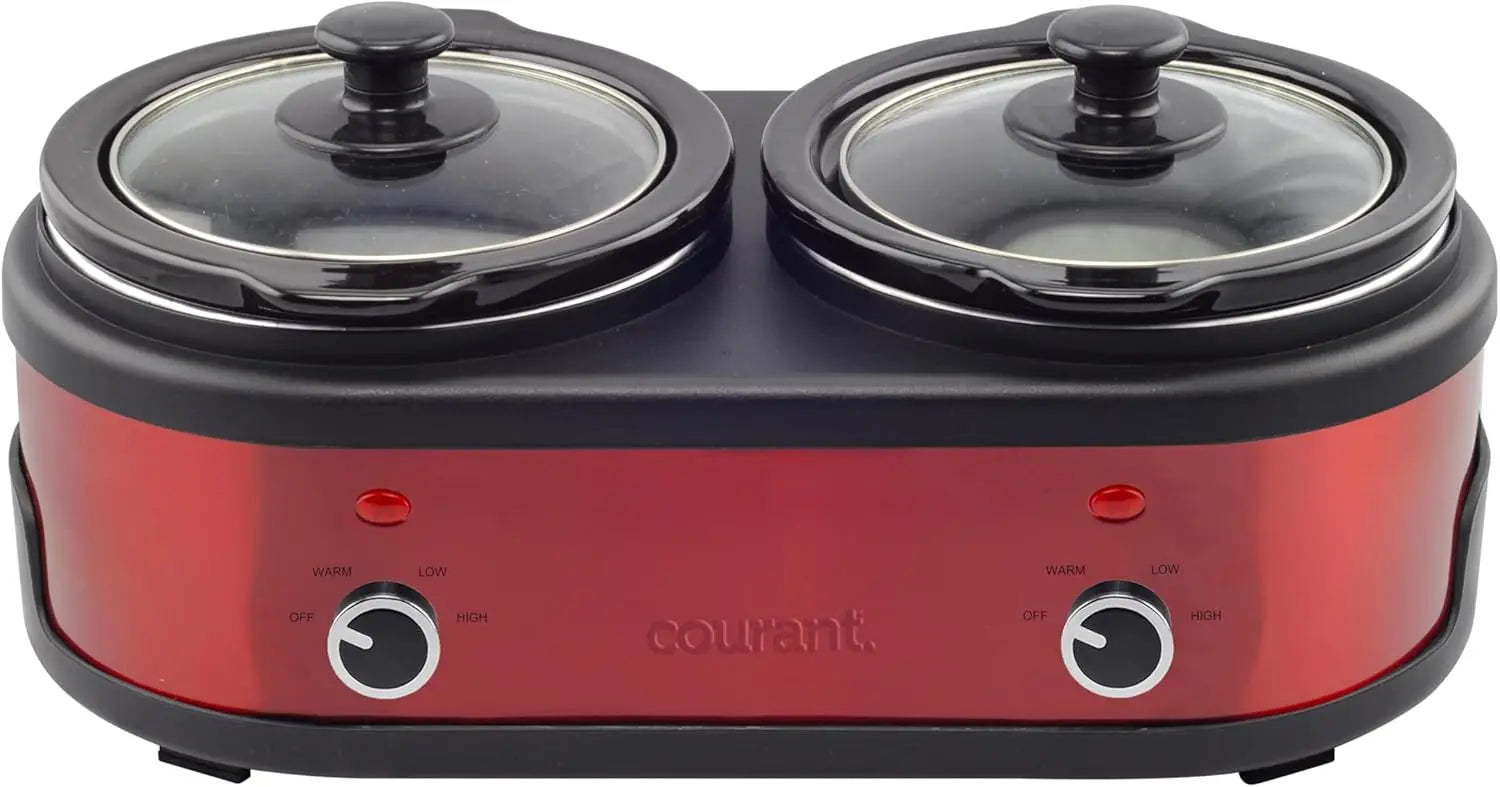 3.2-Quart Double Slow Cooker (1.6-Qt each) w/Warm Settings, Stainproof Stoneware Pots and Glass Lids - Red Stainless Steel