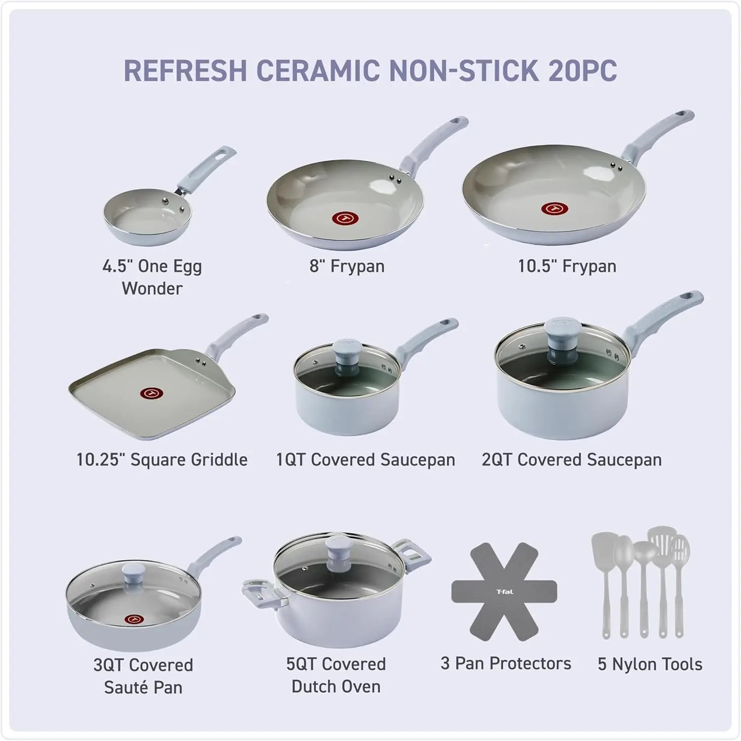 𝐀𝐥𝐥 𝐘𝐨𝐮 𝐍𝐞𝐞𝐝: This set comes with 4.5 Inch Egg Pan, 8 inch and 10.5 inch frypans, 10.25 inch griddle, 1 quart and 2 1uart saucepans with lids, 3.5 quart sauté pan with lids, 5 quart dutch oven with lid, 3 pan protectors, slotted and solid spoons, slotted spatula, spaghetti spoon, and ladle