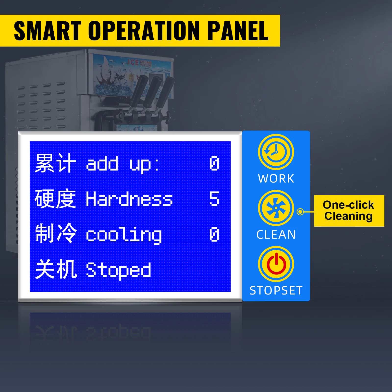 Intelligent LCD Panel Control: You can set the time, temperature, and hardness with the convenient LCD control panel. The quantity will also be displayed on the screen for direct observation, and with just one click, the ice cream machine can quickly start self-cleaning.