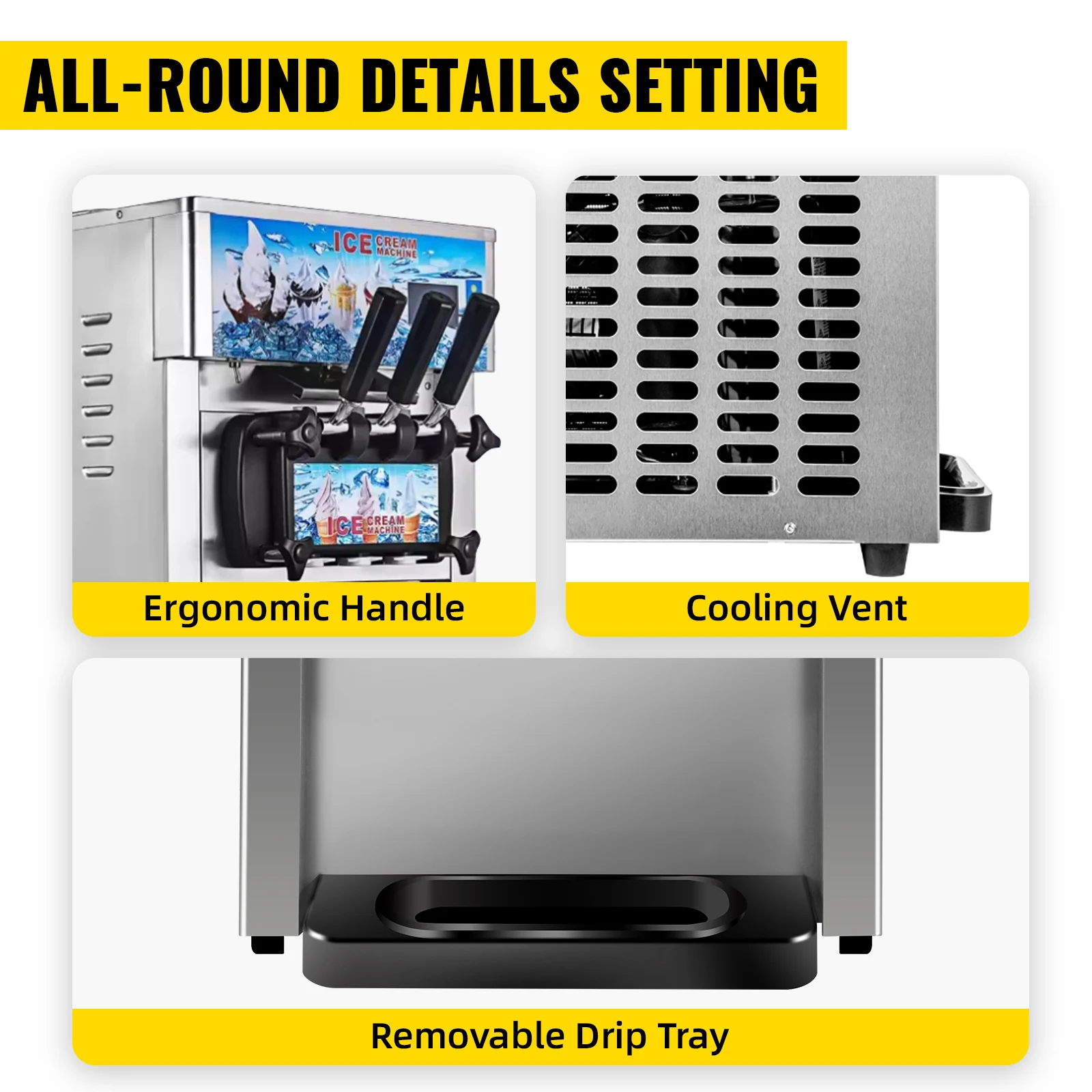 2 Hoppers & 2+1 Flavors: Our soft serve ice cream machine integrates 3 flavors to meet various tastes, including 2 single flavors and 1 mixed flavor. During the mixing process, you can add your favorite foods, such as vanilla, strawberry, chocolate, mango, etc.