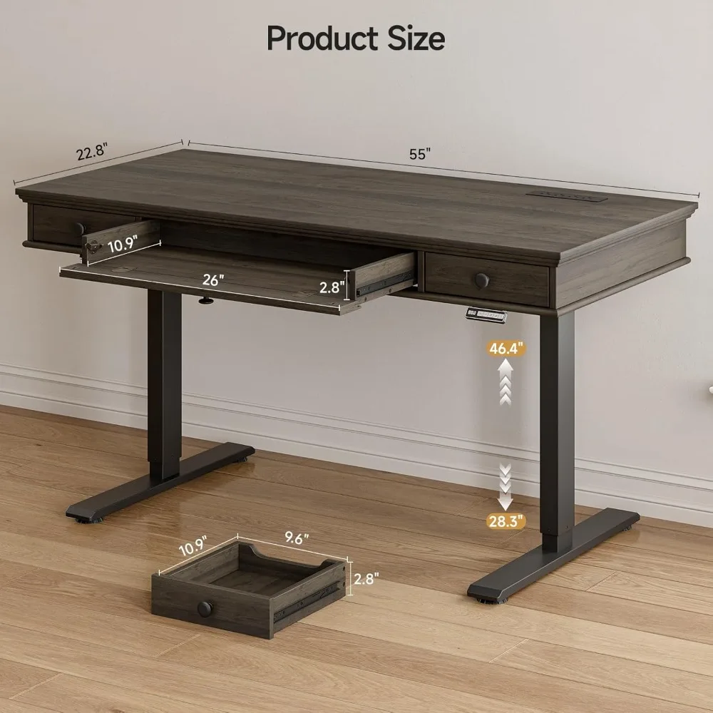 Standing Desk with Drawers, 55 x 23 Inch Electric Height Adjustable Desk with Storage & Outlets, for Computer Workstation