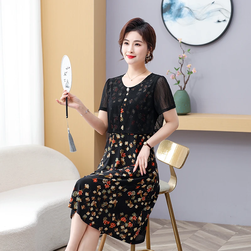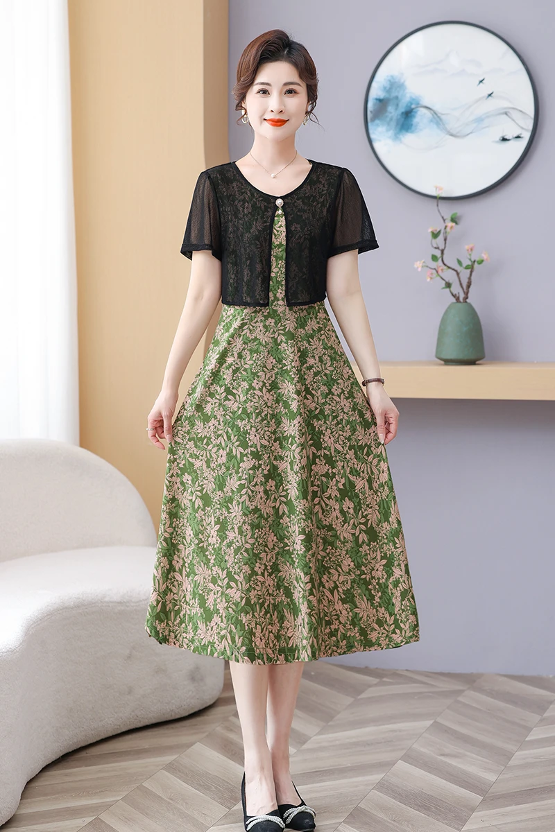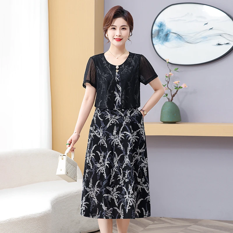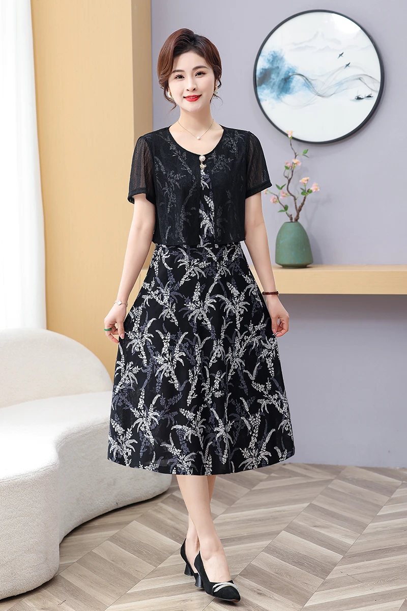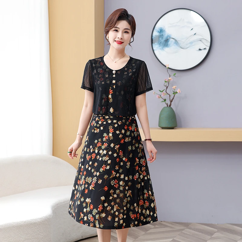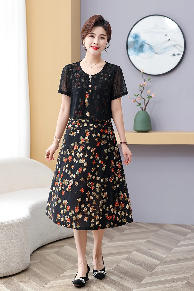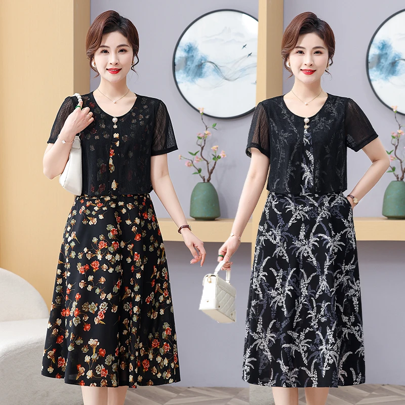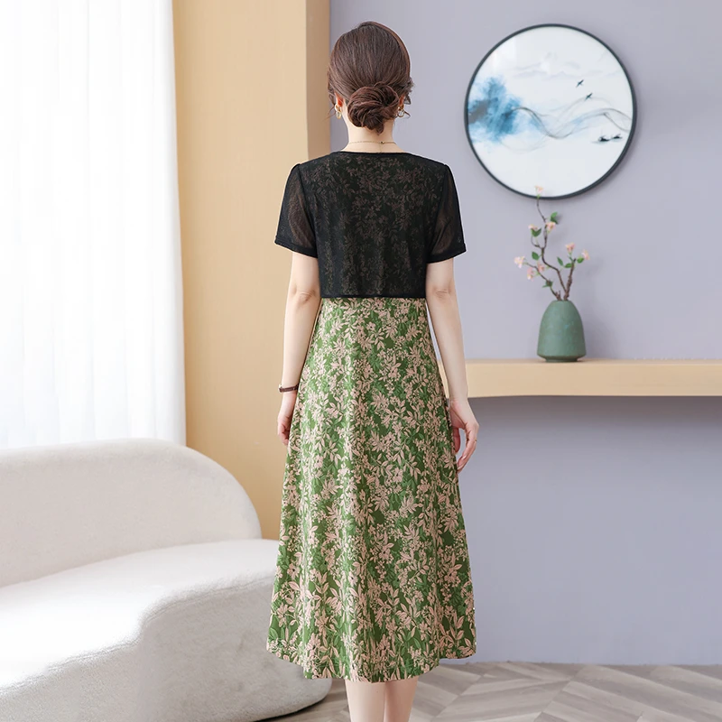 Summer Fake Two Pieces Women's Floral Printed Vestidos Ladies Casual Fashion Short Sleeve Midi Robe Femme Elegant Dress